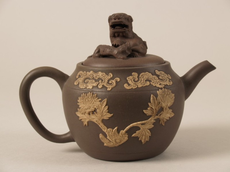 Trekpot met decor van bloemen en knop in de vorm van een leeuw