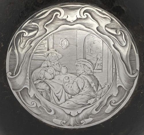 De Ottema-Kingma Stichting heeft een zeldzame reisfles verworven, met een bijzondere herkomst. Het betreft een afgeplatte glazen fles die – ter bescherming – geheel met leer is overdekt. Op dit omhulsel is een drietal zilveren plaques bevestigd. Op de grootste ronde plaat is een voorstelling gegraveerd van drie drinkende mannen in een interieur, terwijl door het raam een jong meisje is te zien.