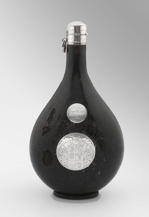 De keerzijde van de fles verraadt de bijzonder herkomst. Hierop bevindt zich namelijk een ronde plaque met een wapen, en daarboven een kleiner plaatje met het opschrift ‘Hobbe Baerdt van Sminia 1670‘.