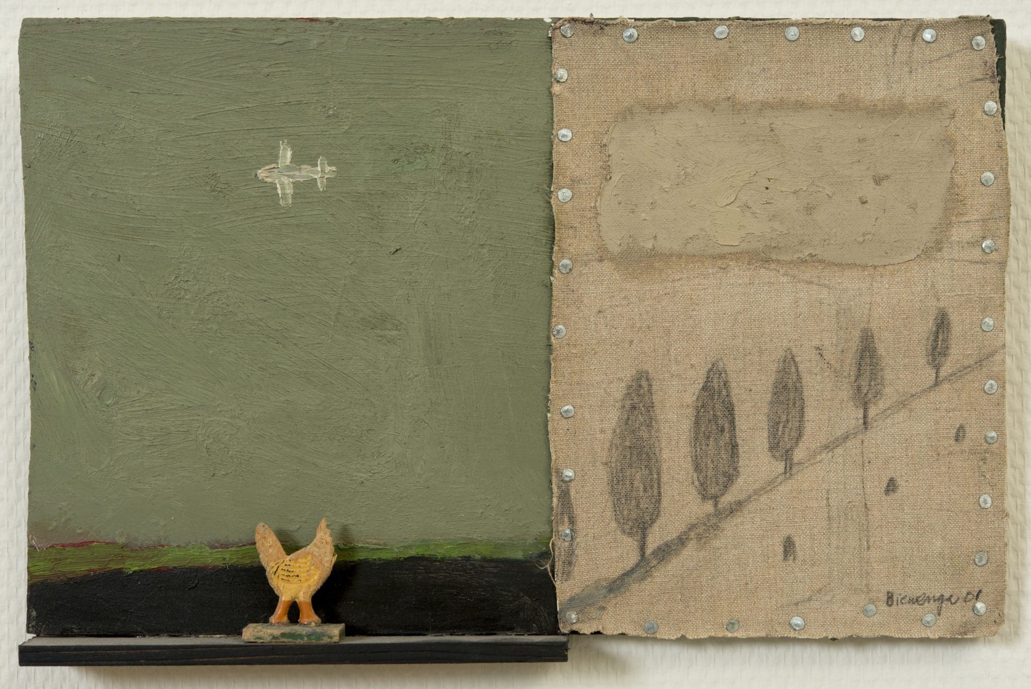 Tot de werken die vorig jaar werden geschonken waren twee schilderijen van de Groninger schilder Wim Biewenga, werkzaam in Havelte (Drenthe). Beide schilderijen zijn verdeeld in twee helften. Bij het schilderij ‘Kip’ (zie afb.) is op een voetstukje een uitgezaagde kip zonder kop te zien tegen een donkere achtergrond met een grote groene lucht erboven. Een vliegtuigje beweegt zich door de lucht. Aan de rechterkant is, meer schetsmatig, een rij bomen te zien onder een wolk.