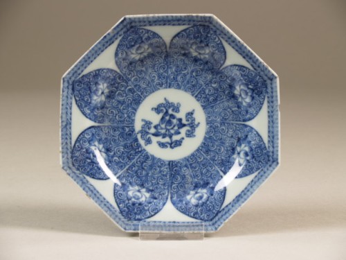 Rechte bodem, v-vormige voetring, bol spreidende wand, recht spreidende achthoekig afgesneden rand. Licht geel brandend porselein met groen getint glazuur. Onderkant voetring afgerond en ongeglazuurd. Versiering: in kobaltblauw. Plat: een lotusbloem, omgeven door vier krullende rankstukjes. Op de rest van de voorkant acht petalen, elk met een lotusbloem op een rechte stengel, op een spiralenfond. Onder de lip een doorlopende tak met fijne, graatsgewijs geplaatste blaadjes. Rand extern: vier grillig getekende takjes.