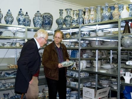 Pieter Tichelaar met de conservator Europese keramiek, Jaap Jongstra, bij de BCT in het museumdepot aan de Voorstreek |