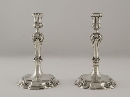 De verwerving van zilveren voorwerpen komt sinds de oprichting van de OKS met vaste regelmaat voor. Recentelijk heeft de OKS een paar kandelaren aangekocht van de Leeuwarder zilversmid Berend Roelofs Storm. Hij vervaardigde de kandelaren in 1760, een jaar nadat hij zijn meesterproef had behaald, waarmee de stukken tot diens vroegst bekende werk behoren. Voor de Collectie Fryslân hebben de kandelaren nog extra betekenis: Ze bevatten de alliantiewapens van dr. Nicolaas Arnoldi (1696-1777) en zijn vrouw Barbara Knock (1699-1784). Arnoldi is bekend geworden als een invloedrijk bestuurder in Fryslân. Zo was hij een aantal malen burgemeester van Leeuwarden en had hij als secretaris en thesaurier-generaal een belangrijke positie aan het Stadhouderlijk Hof. | ![]() |