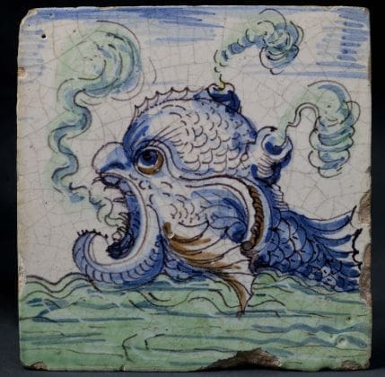 De vierde aanwinst betreft een vroeg 17de-eeuwse tegel uit Rotterdam, die door de OKS in bruikleen is gegeven aan Keramiekmuseum Princessehof. Het is een veelkleurige tegel met een schildering van een vervaarlijk uitziend fantasie zeewezen, dat – met stoom blazend uit oren en mond – uit een kolkende zee opdoemt. Rotterdamse tegels uit het begin van de 17de eeuw zijn relatief zeldzaam, het verworven exemplaar vormt daarbinnen een uitzonderlijk fraai voorbeeld. Er zijn van dezelfde maker slechts twee andere tegels bekend, welke zich in particuliere collecties bevinden. Daarnaast is de afbeelding zelf uniek en zijn de uitvoering van het schilderwerk en het kleurgebruik van hoog niveau. Het resultaat is een bijzonder levendig en humoristisch weergegeven zeewezen. De tegel past naadloos in het verhaal dat het Keramiekmuseum Princessehof wil vertellen, namelijk de geschiedenis en ontwikkeling van het Friese aardewerk in een bredere, Nederlandse context | ![]() |
